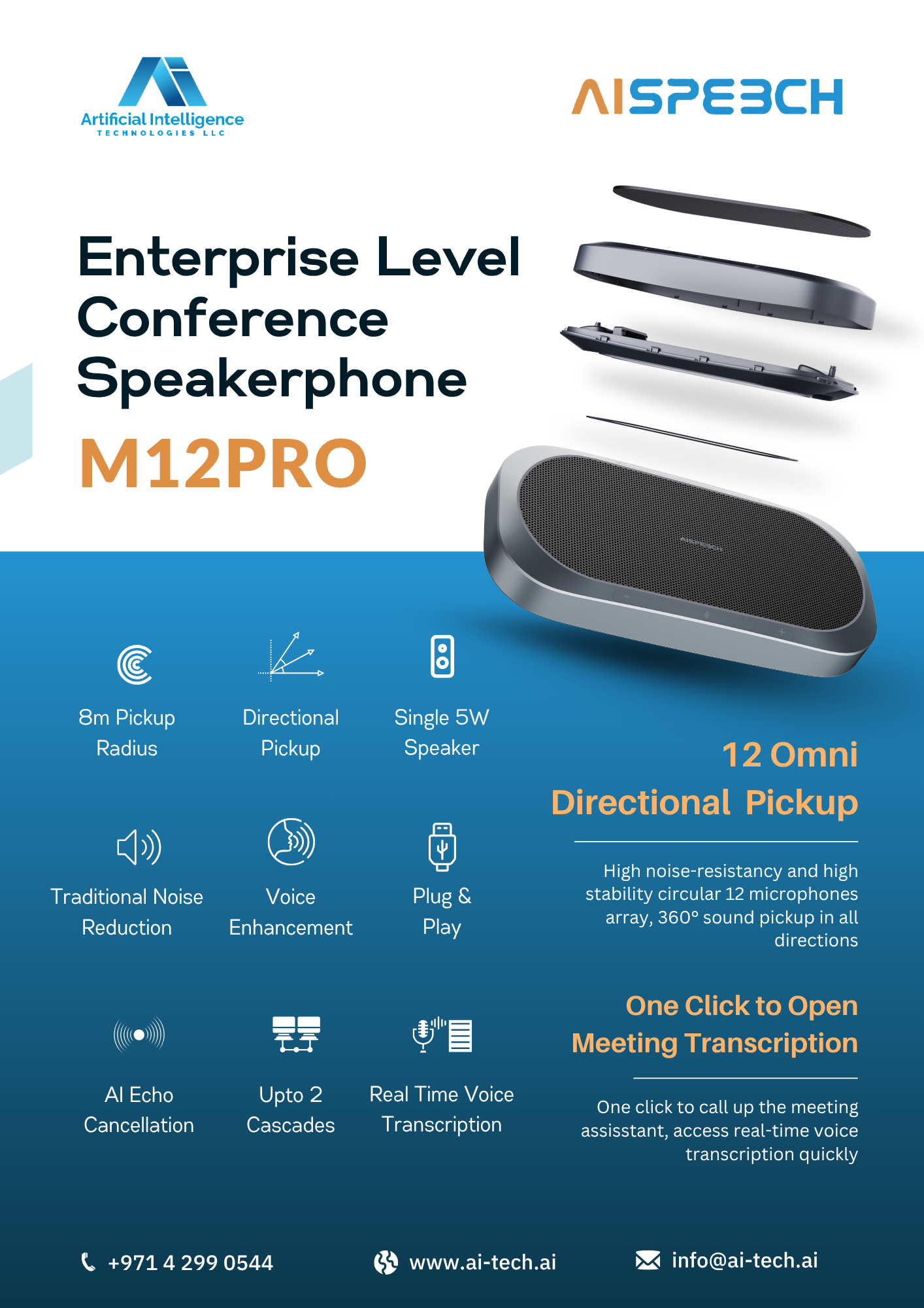 The AISPEECH M12 Pro is a premium conference speakerphone built for larger meeting rooms and hybrid teams. With powerful 360° voice pickup, advanced AI noise cancellation, and immersive high-fidelity sound, it ensures seamless, natural communication in any setting.