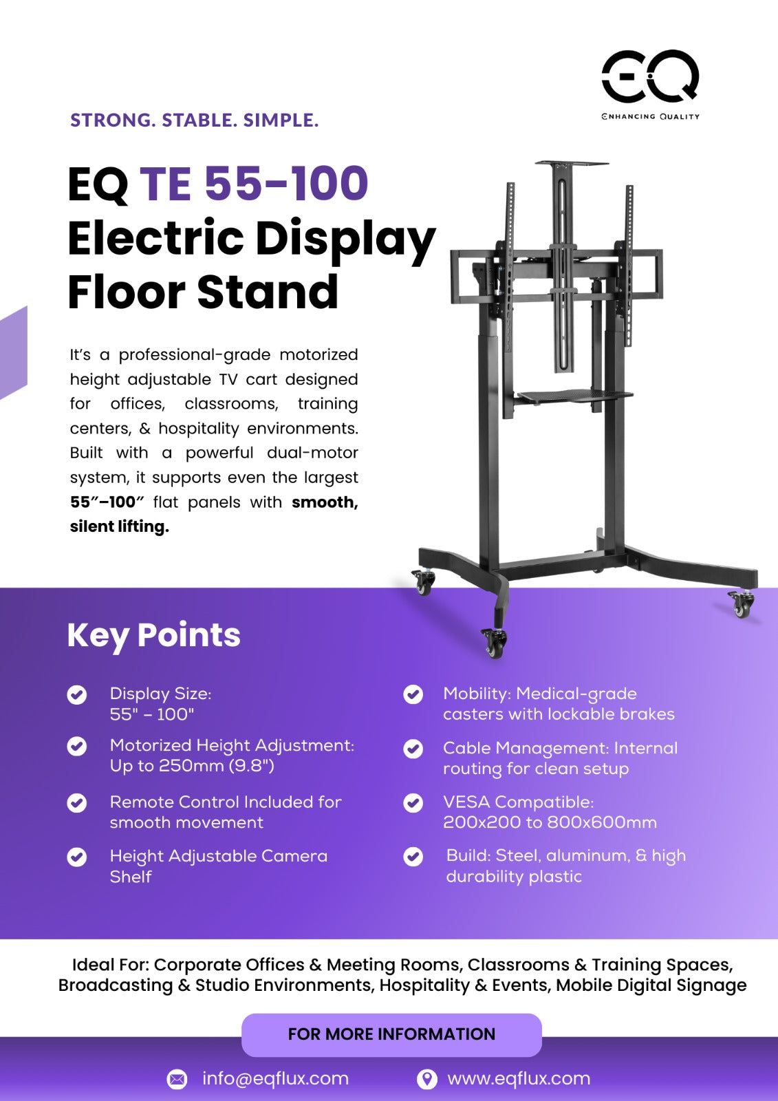 The EQ 55-100 is a professional-grade motorized height adjustable TV cart designed for offices, classrooms, training centers, and hospitality environments. Built with a powerful dual-motor system, it supports even the largest 55″–100″ flat panels with smooth, silent lifting.