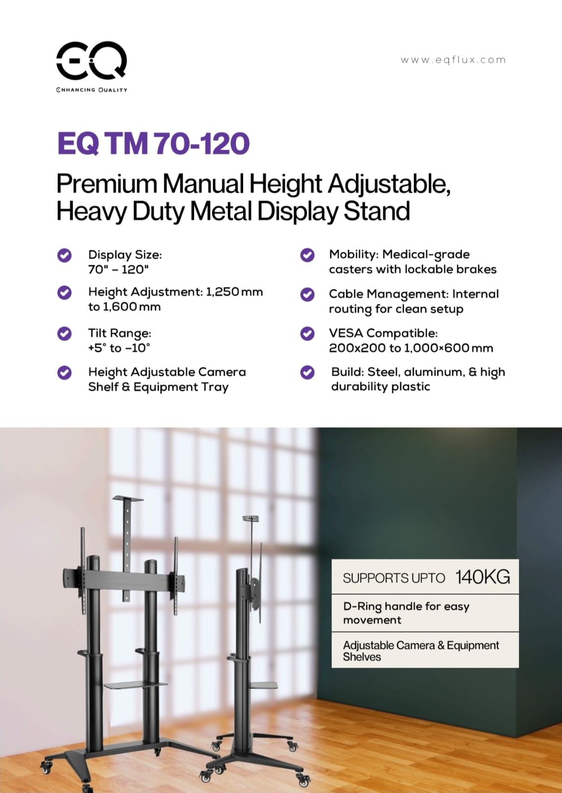 The EQ TM 70‑120 is a premium manual-height-adjustable TV cart, expertly designed for 70″–120″ flat-panel displays. Featuring an ultra-strong yet lightweight aluminum column mounted on a sleek steel base, it delivers unmatched stability during transport and setup.